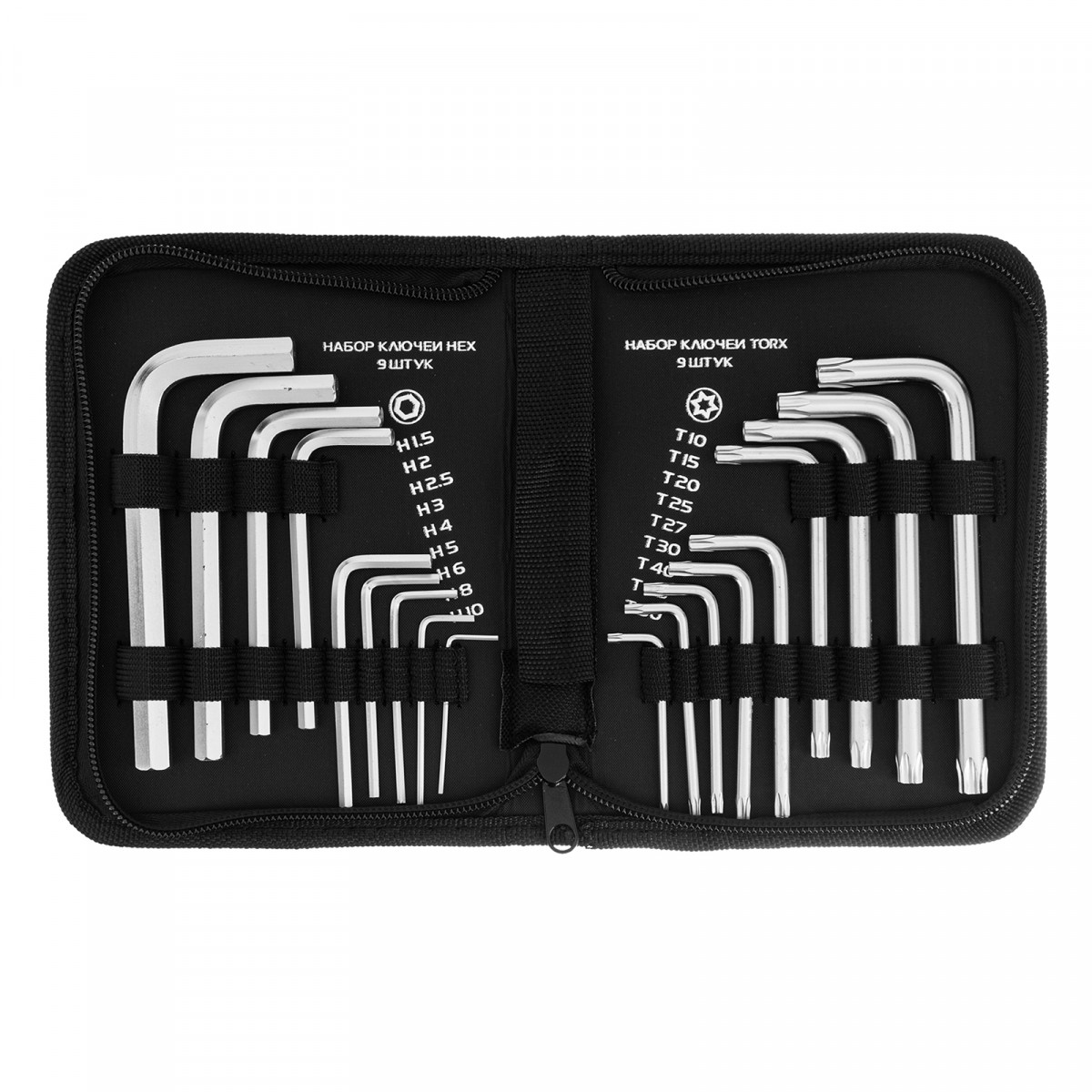 • Универсальность — набор включает 18 ключей с шестигранным и звездообразным профилем для работы с крепежом самых ходовых типоразмеров.