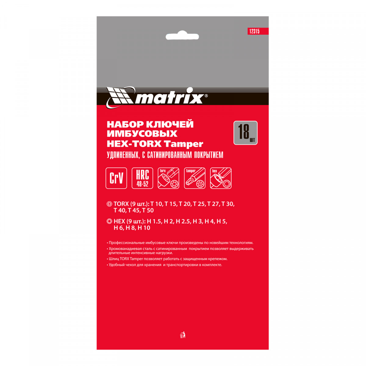 Набор ключей имбусовых HEX-Torx , 18 шт: HEX 1.5-10 мм, T10-T50, CrV, удлиненных, с сатиновым покрытием Matrix