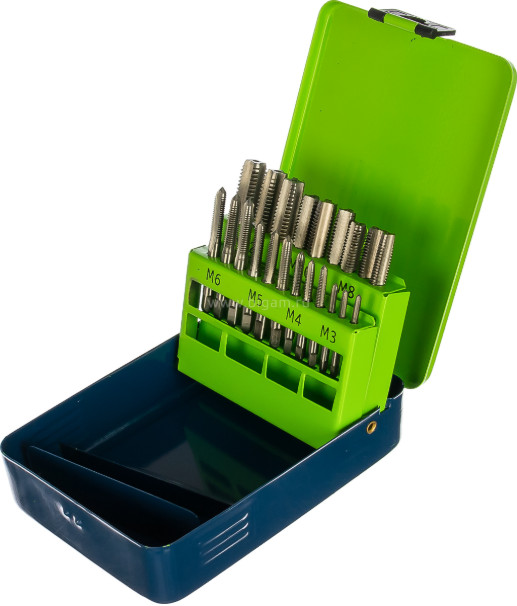 Набор метчиков и плашек является универсальным и используется для нарезания как внешней, так и внутренней резьбы (от М3 до М12). Кроме метчиков и плашек в набор также входят воротки для метчиков и плашкодержатели.