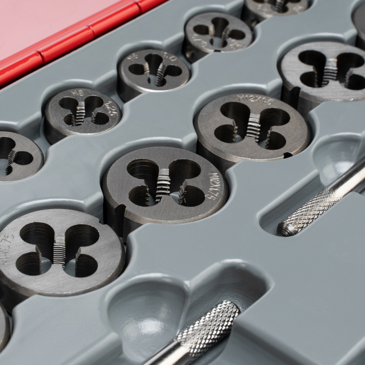 - Быстрый поиск нужного инструмента — на каждый предмет нанесено обозначение размера и шага резьбы.