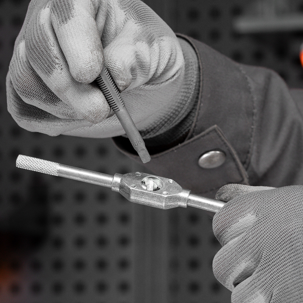 • Универсальный метчикодержатель — регулируемый винтовой механизм позволяет надежно фиксировать метчики с хвостовиками от 2,4 до 6,4 мм.