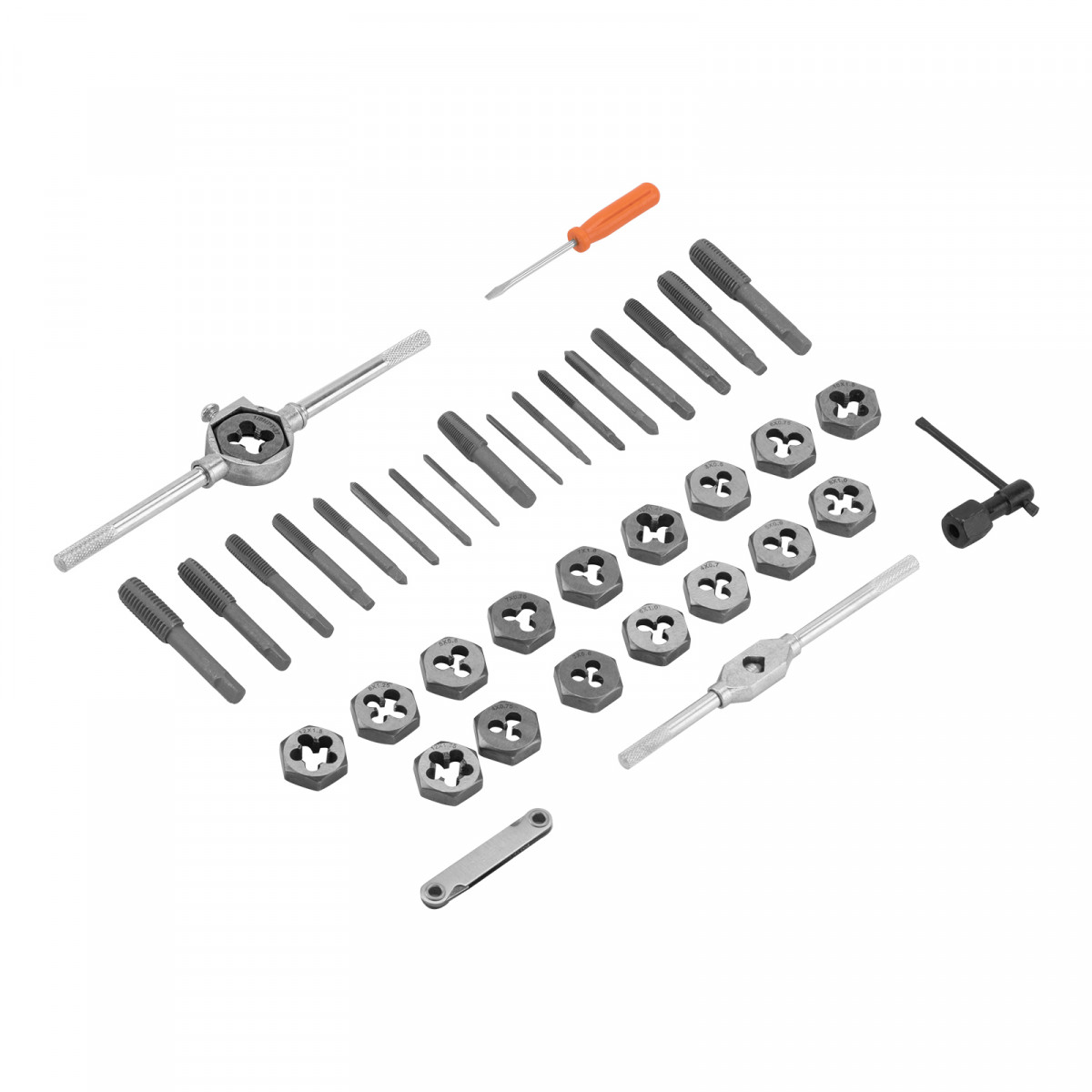 Набор метчиков и плашек М3-М12 Sparta 773155 из 40 предметов, с плашко- и метчикодержателем, в пластиковом боксе, используется для нарезания внешней и внутренней резьбы разного размера. Позволяет работать как с глухими, так и со сквозными отверстиями. Набор будет полезен при выполнении ремонтных работ, подойдет для домашнего применения.