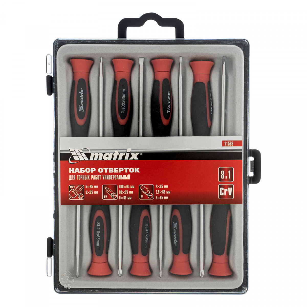 Универсальный набор отверток Matrix 11588 из стали CrV состоит из 8 шт. и предназначен для точных работ с мелкими резьбовыми соединениями. Включает отвертки со шлицами Torx, PH и SL. Набор рекомендован для профессионального использования и будет полезен во время ремонта мобильной техники, компьютеров, часов, очков.