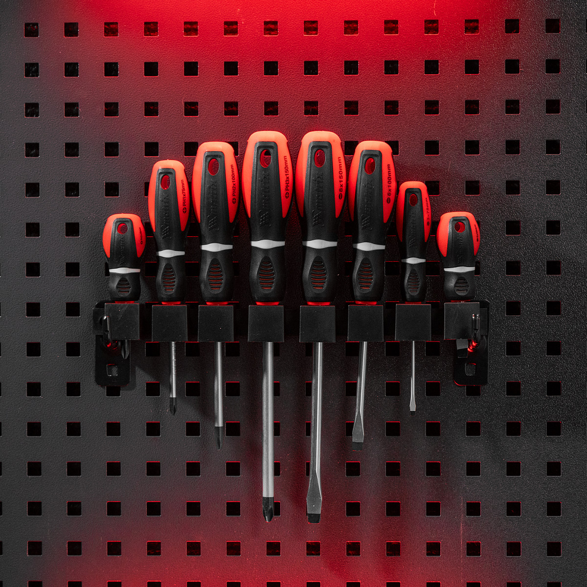 - Удобное хранение — отвертки поставляются в комплекте с пластиковой подвесной полкой.
