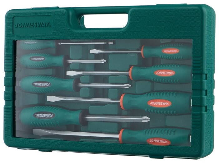 Набор ударных отверток Jonnesway D70PP10S используется для закручивания и выкручивания различных крепежей. Инструмент лежит в кейсе для удобной транспортировки. В наборе есть прямые и крестовые отвертки различного диаметра.