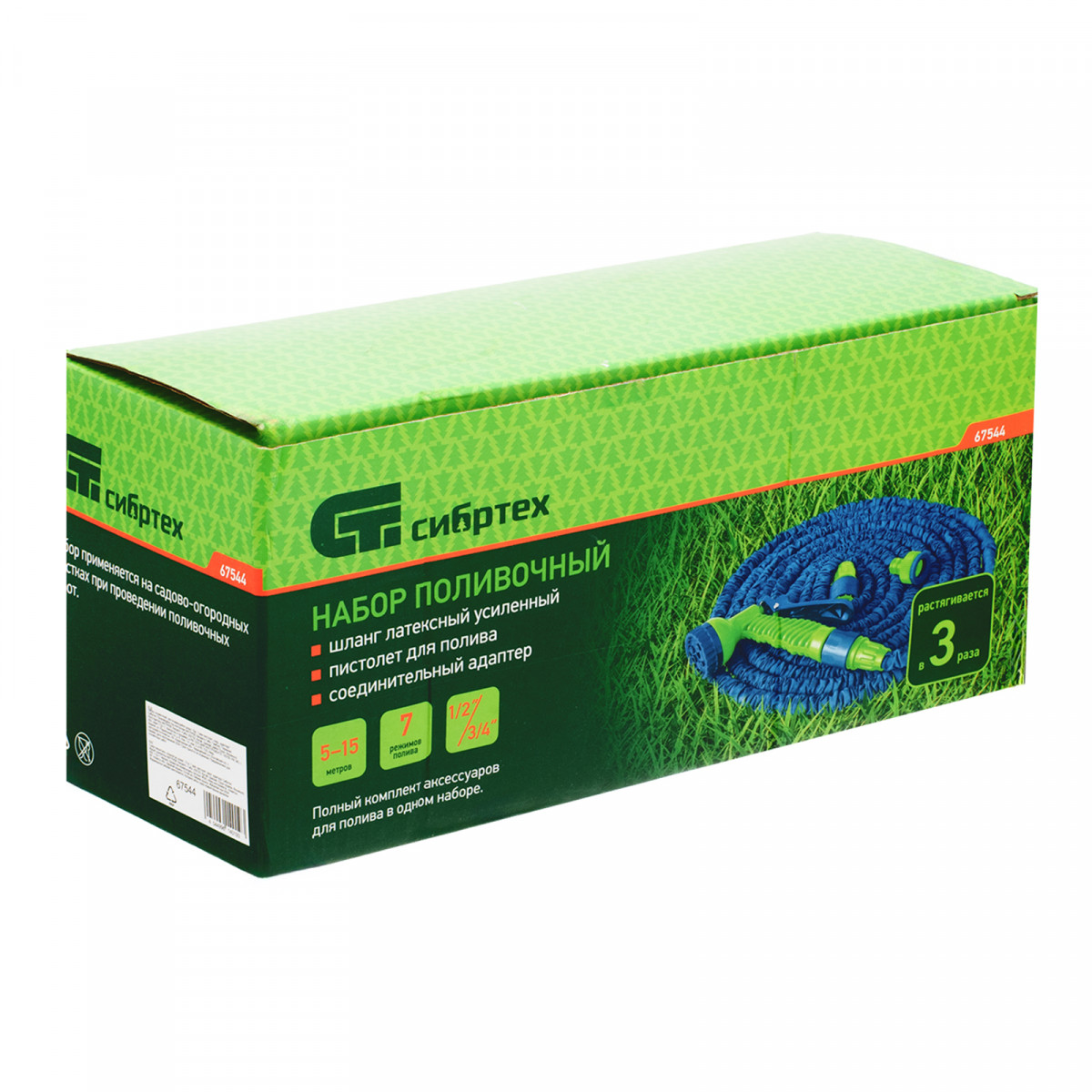 Поливочный набор Сибртех 67544 состоит из растягивающегося шланга длиной 15 м, 7-режимного пистолета, соединителя, адаптера, и представляет собой готовую систему орошения. Благодаря переходнику шланг можно подключить к крану или отводу диаметром 1/2" или 3/4". Набор пригодится владельцам дачных участков, также может использоваться для ухода за растениями в скверах или парках.