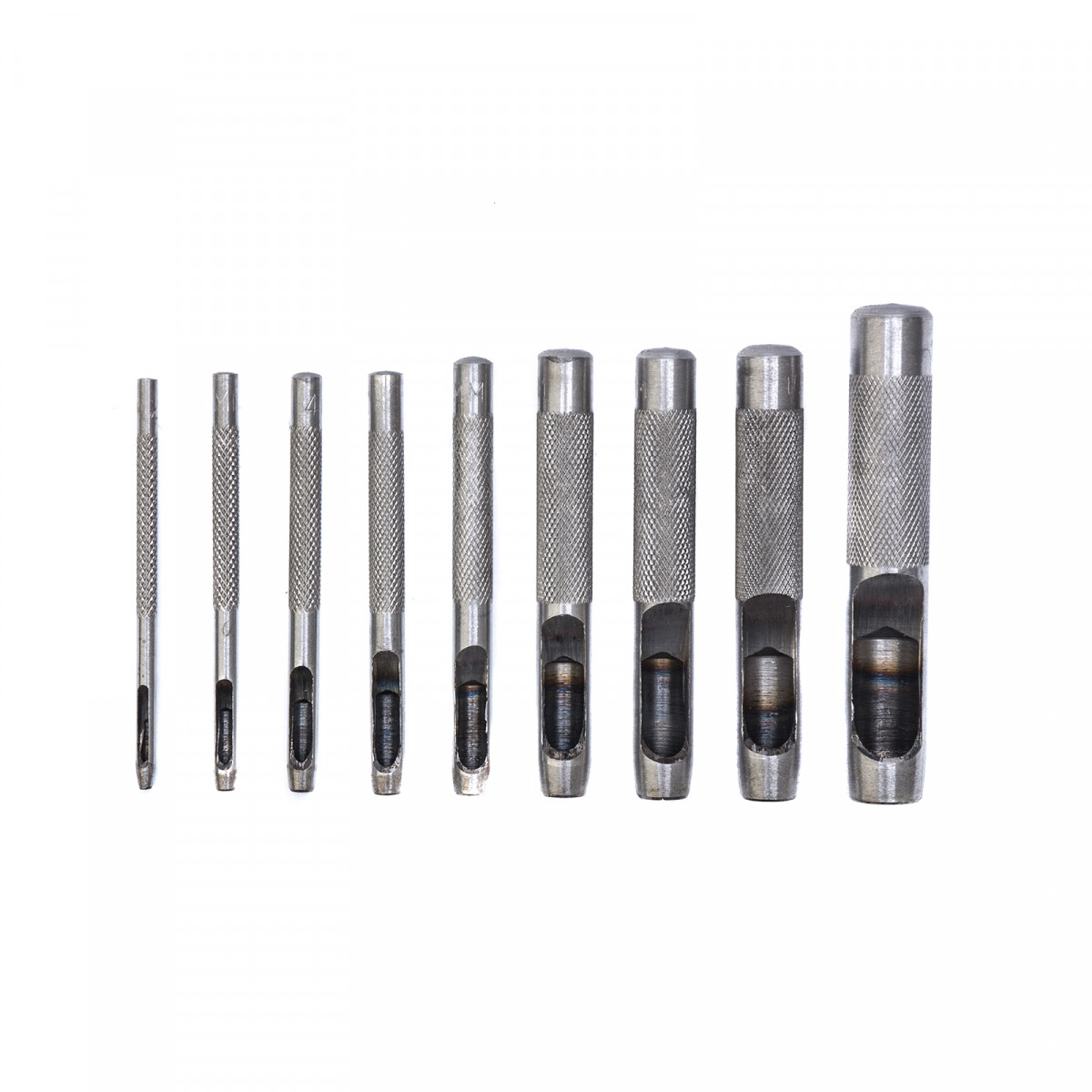 Набор пробойников для кожи Сибртех 18309, 9 шт. в чехле, позволяет пробить отверстия диаметром 2, 3, 4, 5, 6, 8, 9, 10 и 13 мм посредством ударного воздействия от киянки. Инструменты предназначены для работы с плотными материалами: кожей и резиной. Благодаря высокоточной прецизионной заточке режущих кромок пробойники выполняют ровный и качественный рез.