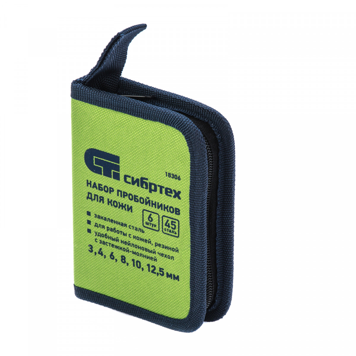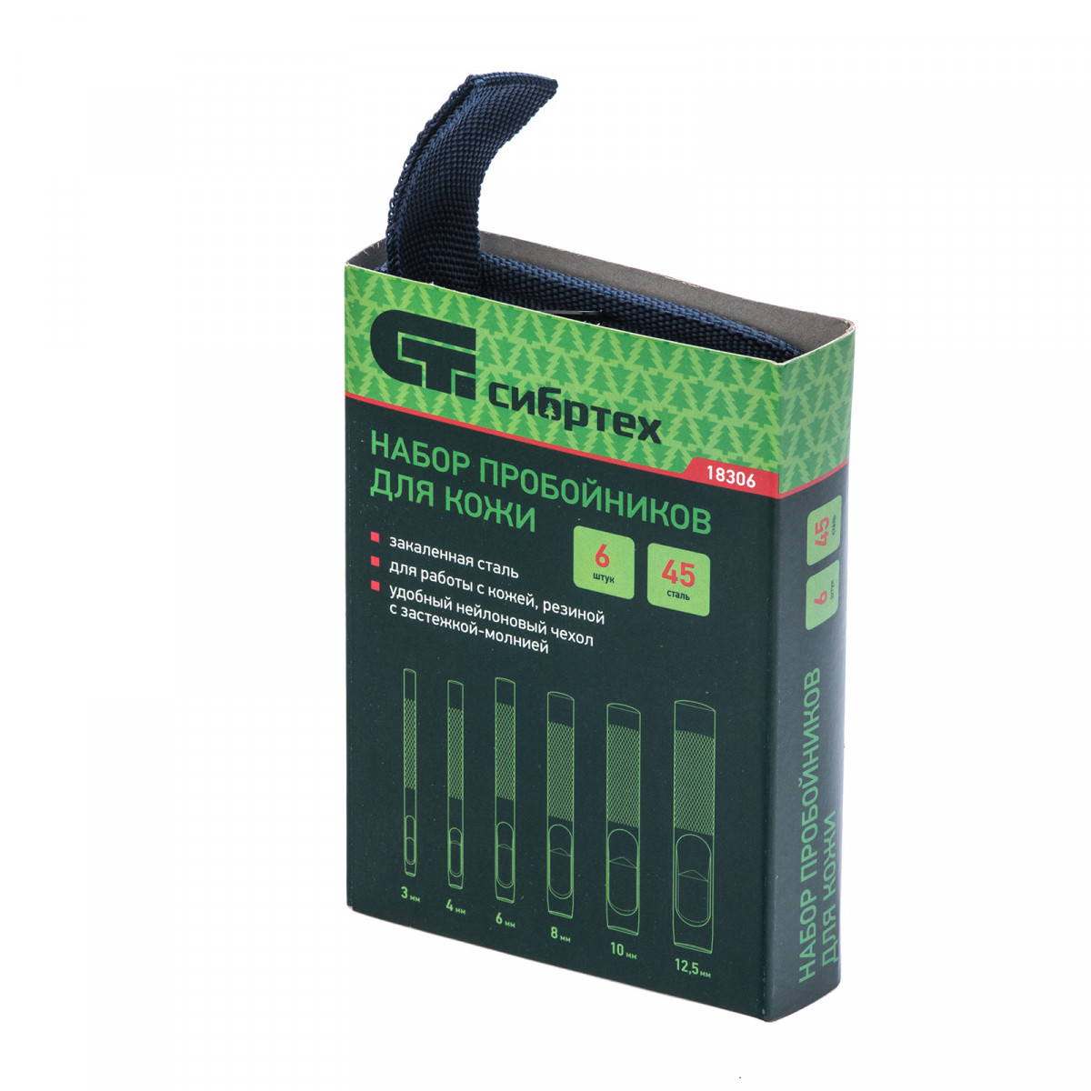 Набор пробойников для кожи Сибртех 18306, 6 шт. в чехле, позволяет пробить отверстия диаметром 3, 4, 6, 8, 10 и 12,5 мм посредством ударного воздействия от киянки. Инструменты предназначены для работы с плотными материалами: кожей и резиной. Благодаря высокоточной прецизионной заточке режущих кромок пробойники выполняют ровный и качественный рез.