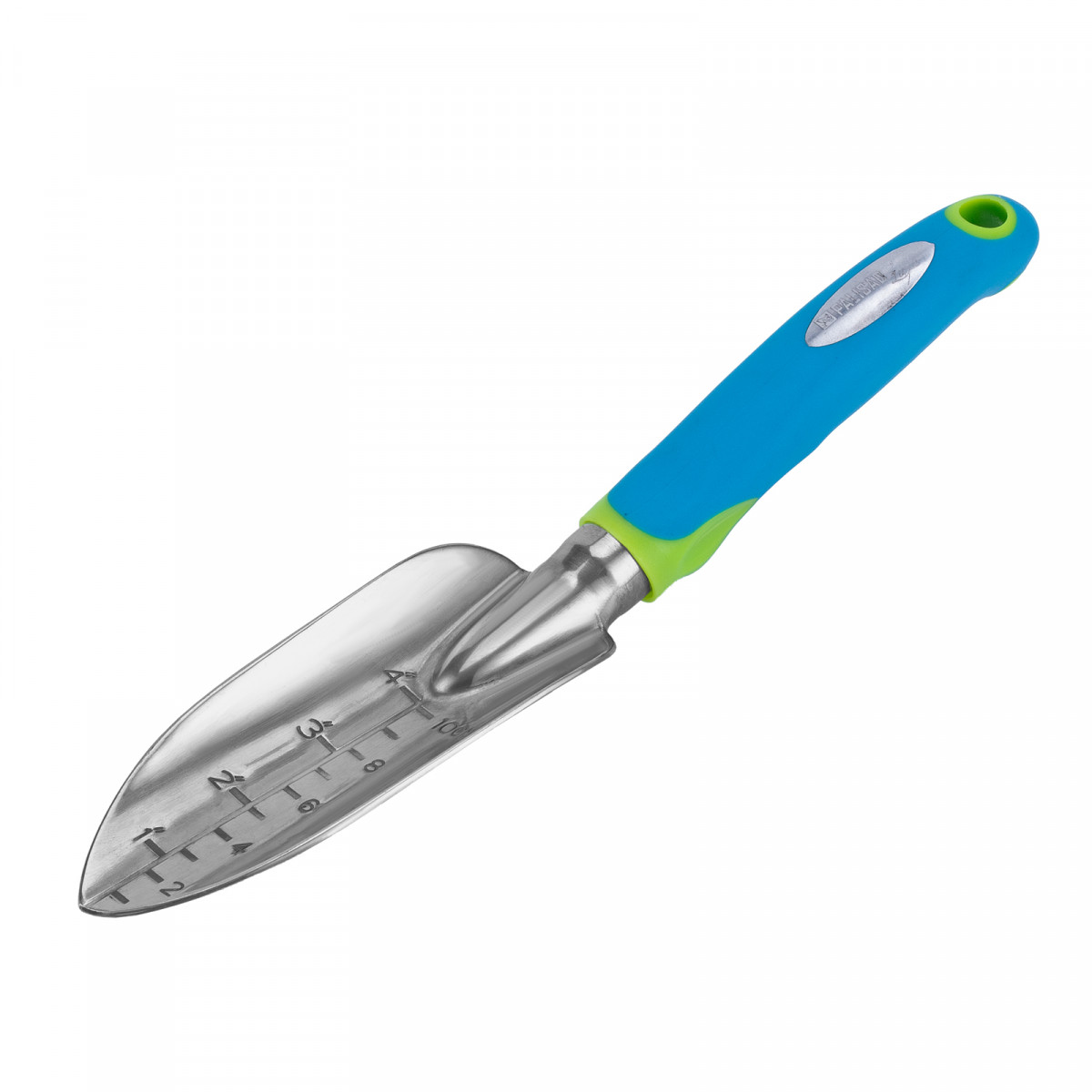 • Удобная эксплуатация — на рабочей части совка имеется мерная шкала, позволяющая контролировать глубину погружения в почву, зубья рыхлителя с заостренными кончиками легко проникают в грунт.
