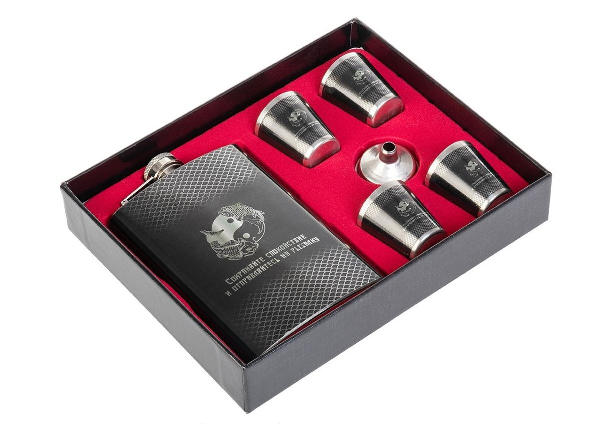 В подарочный набор "Сохраняйте спокойствие " входит: фляжка (270 мл) декорированная матовым напылением, создающая эффект гравировки, 4 стопки и воронка.