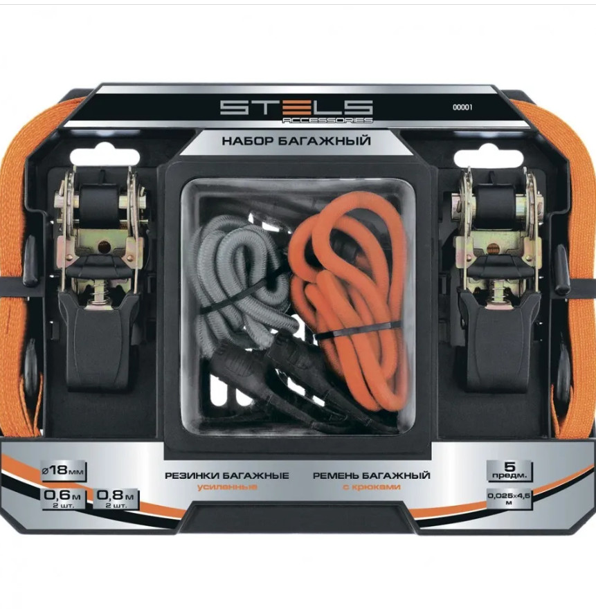 Набор стяжек и резинок для фиксации грузов STELS 54403 - багажный набор для крепкого удержания перевозимых грузов. В комплекте представлено 2 резинки круглого сечения с крюками, а также 2 плоских ремня с застегивающимися механизмами. Вес: 1.45 кг. Размеры: 375х315х235 мм. Максимальная нагрузка: стяжки - 200 кг, резинки - 30 кг. Стяжки груза (размеры) 2*0,025*4,5 м.