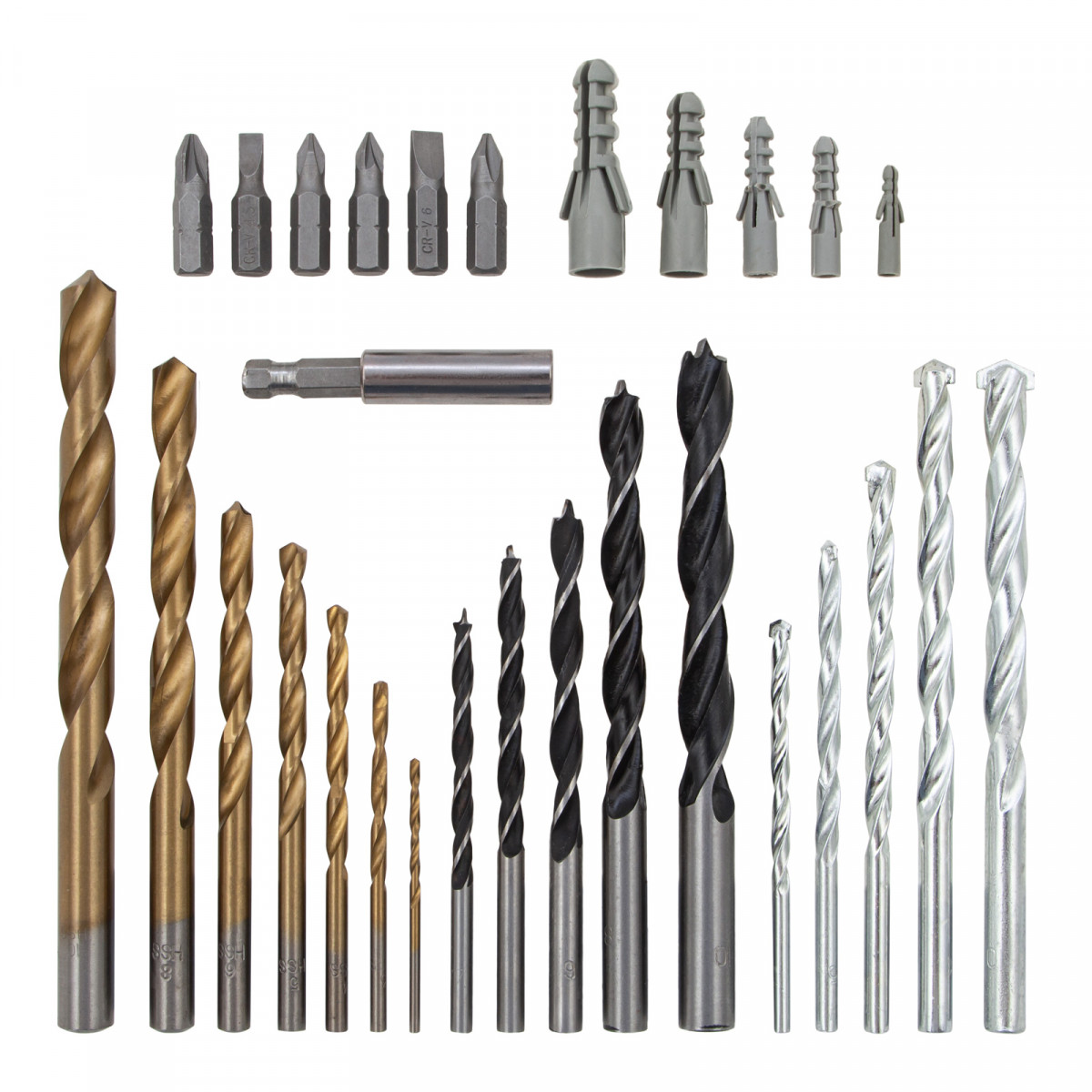 • Прочность и долговечность — биты выполнены из стали 45Х, сверла по дереву — из углеродистой стали, а сверла по металлу — из быстрорежущей стали HSS.