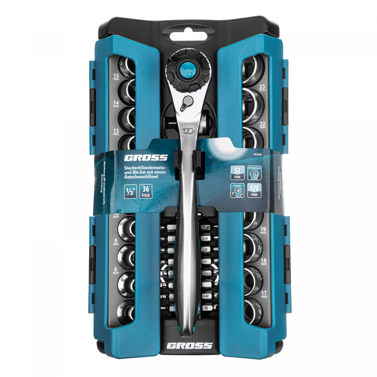 Набор торцевых головок, трещотка 120 зубьев, 1/2", CrV, 36 предметов Gross
