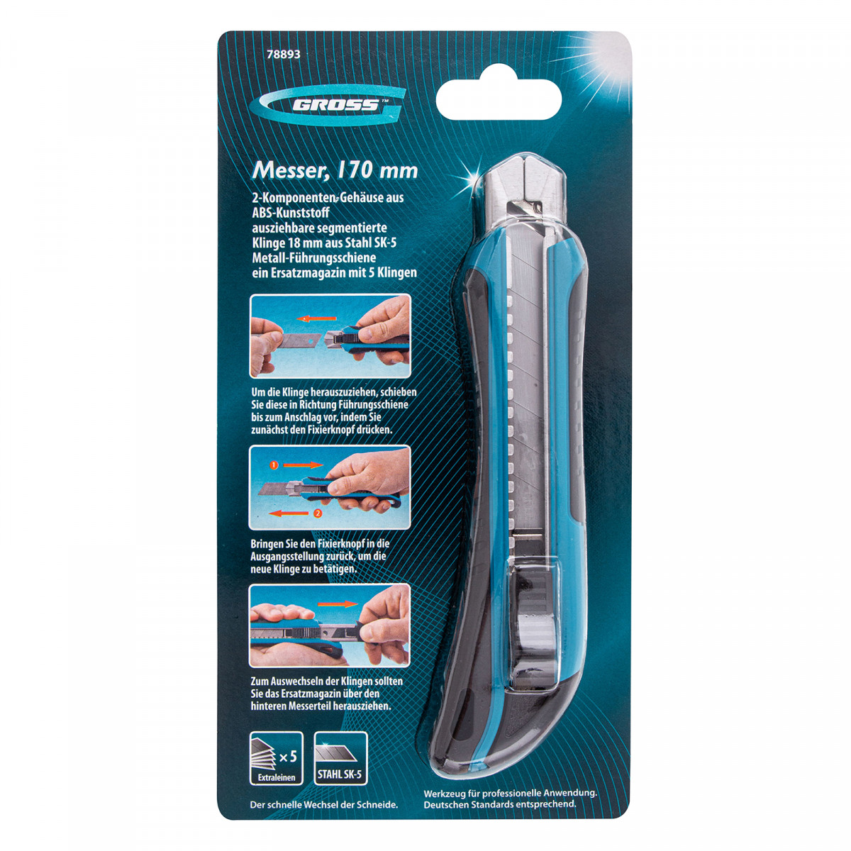 Нож Gross 78893 длиной 170 мм, с обрезиненным ABS-корпусом, выдвижным сегментированным лезвием шириной 18 мм из стали SK-5 и металлической направляющей, с 5 лезвиями, предназначен для профессионального использования в ходе ремонтно-монтажных работ. Пригодится также для решения бытовых задач. Нож легко режет бумагу, картон, кожу, поможет раскроить линолеум или обои. Благодаря металлической направляющей инструмент не сломается даже при работах со значительным усилием.