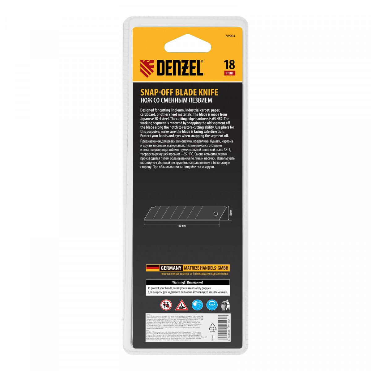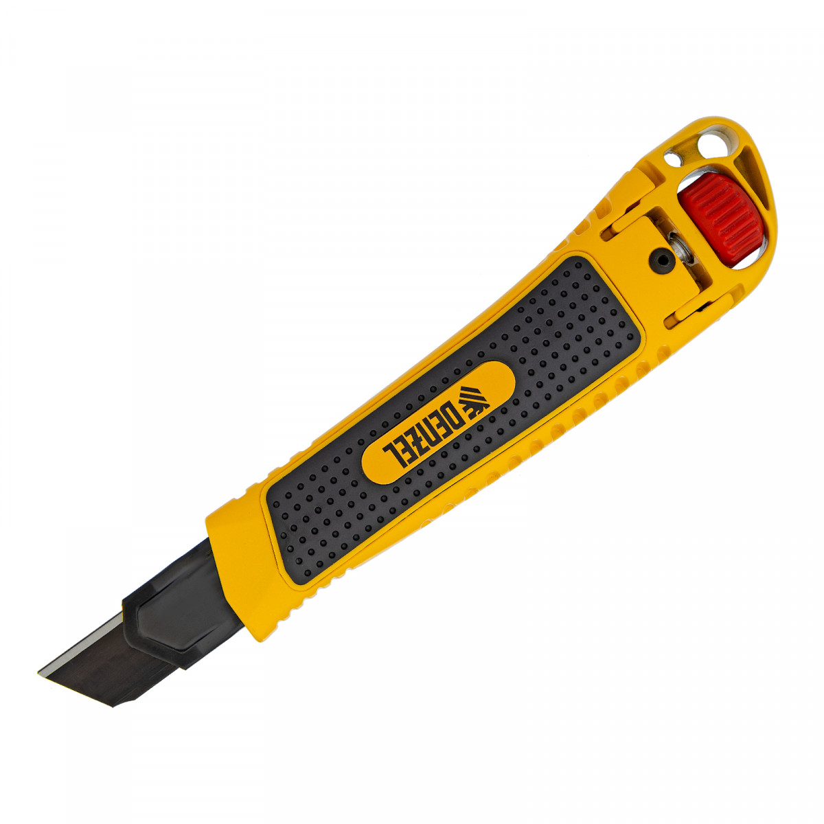 Нож, 18 мм, сменное лезвие, SK4, корпус из цинкового сплава + TPR, торцевой зажим Denzel