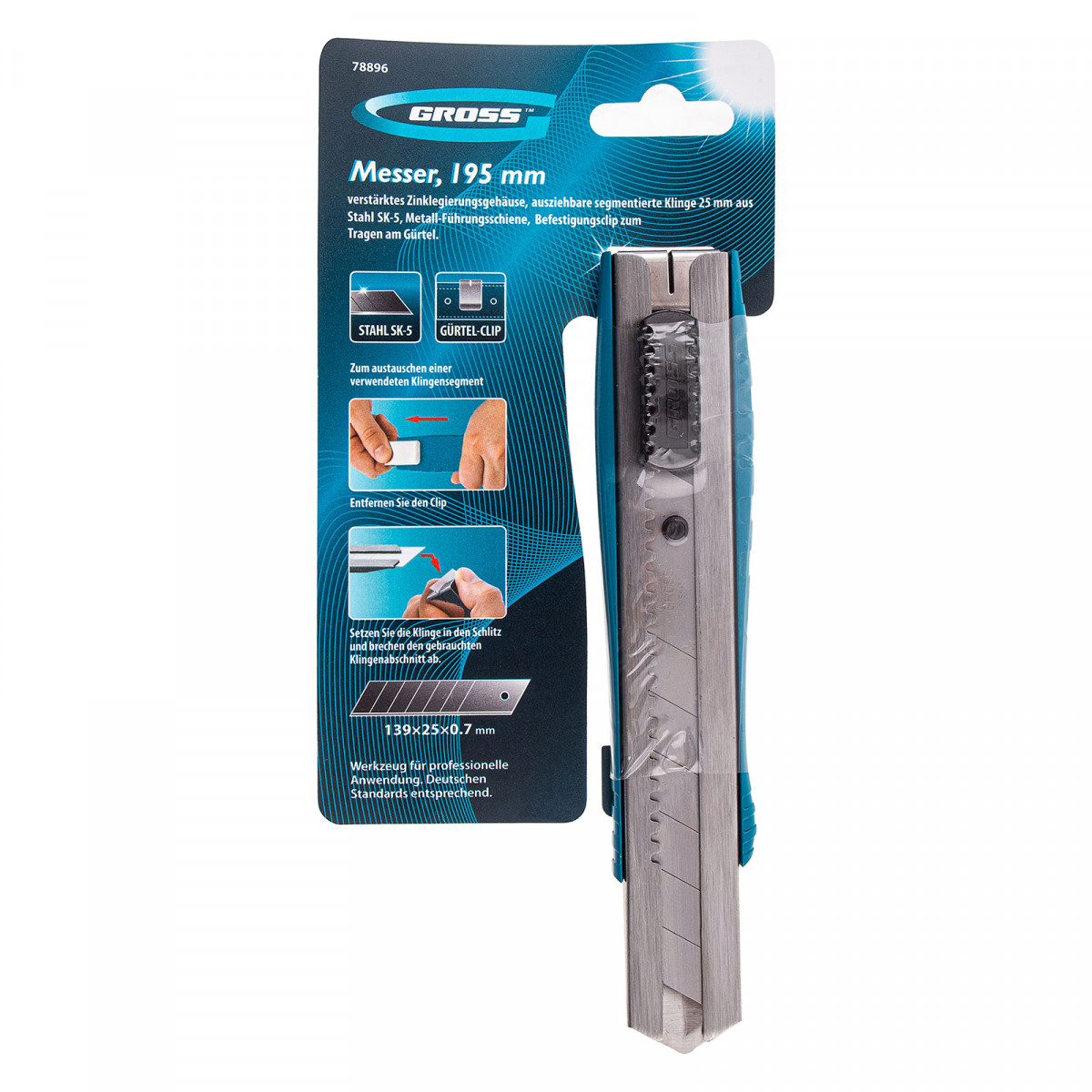 Нож Gross 78896 из стали SK-5, длиной 195 мм, в металлическом корпусе, с выдвижным сегментным лезвием шириной 25 мм, металлической направляющей и клипсой для ремня, — профессиональный инструмент, предназначенный для разрезания линолеума, картона, кожи, обоев и других материалов. Используется при проведении ремонтных и отделочных работ, будет полезен в хозяйстве.