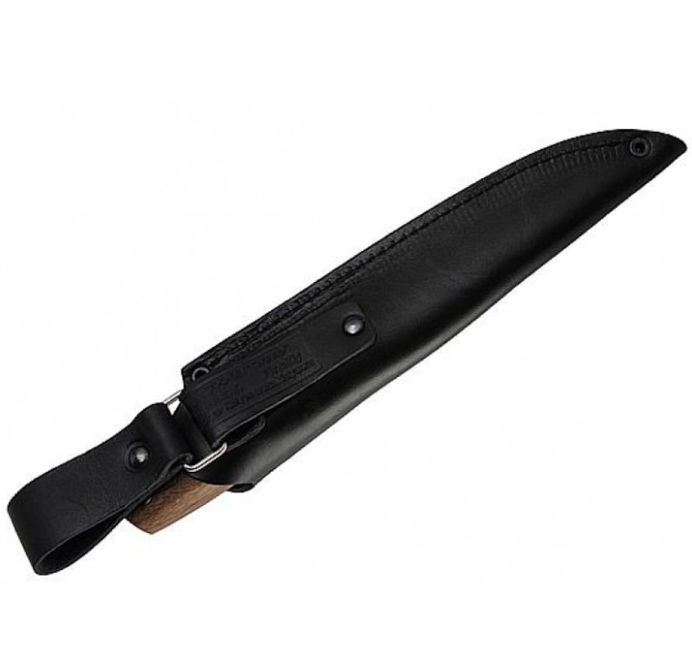 Нож "Финский" с ореховой рукояткой выполнен в классическом скандинавском стиле. Клинок прямой формы с чуть опущенным острием. Спуски выполнены клином от обуха, а сам клинок сужается от рукояти к острию. Такая форма спусков очень удобна, получила хорошие отзывы наших покупателей, и используется на многих моделях Кизляр. Отверстие для темляка оформлено развальцованной трубкой из нержавеющей стали. Ножи комплектуются кожаными ножнами погружного типа с дополнительной петлей подвеса, дающей ножнам значительную степень свободы.