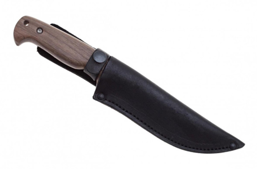 Широкий массивный клинок изготовлен из нержавеющей стали, которая придает ему высокую прочность на излом. Хвостовик, повторяющий форму рукояти, обеспечивает максимальную надежность монтажа. Рукоять имеет выемки под пальцы и надежно фиксирует ладонь между крупным упором и выполненной в виде крюка пятой - можно быть уверенным, что пальцы ни при каких обстоятельствах не соскользнут на режущую кромку, а нож не выскочит из руки при резких движениях. Материалом для накладок рукояти послужил кавказский орех. В комплекте поставляются ножны с петлей для ношения на поясе.
