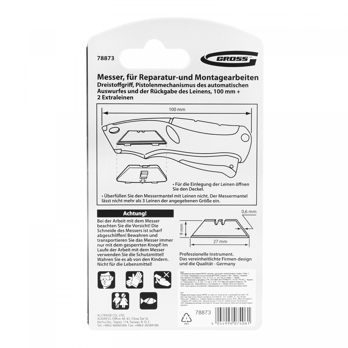 Ремонтно-монтажный нож Gross МИНИ 78873 длиной 100 мм, с трехкомпонентной рукояткой, автоматическим выбросом и возвратом лезвия, с 2 запасными полотнами, используется для разрезания бумаги, обоев, картона, линолеума, кожи. Прочное трапециевидное лезвие из высококачественной японской стали SK-2 толщиной 0,6 мм и шириной 9 мм не ломается и долго не тупится. Нож рекомендован для профессионального применения, а также будет полезен в быту.