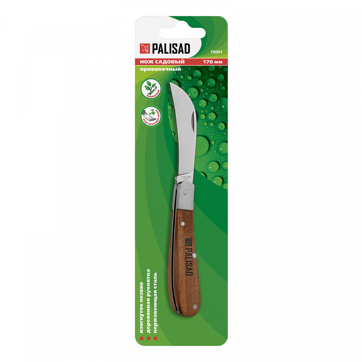 Складной садовый нож Palisad 79001 длиной 170 мм, с деревянной рукояткой, имеет изогнутое лезвие серповидной формы, поэтому легко срезает ветки и грибы. Он пригодится садоводам для удаления шипов со стеблей, зачистки поперечных срезов и т.д. Нож складной конструкции удобно транспортировать и хранить, т.к. лезвие спрятано в корпус. Для сохранения остроты лезвия и предотвращения появления налета рекомендуется после использования протирать его сухой салфеткой и смазывать маслом.