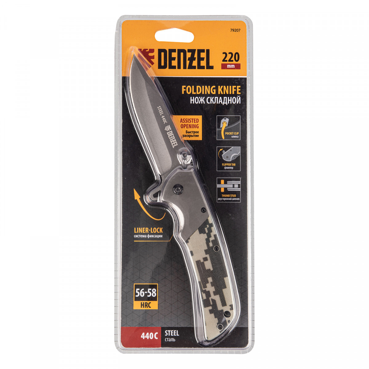 Многоцелевой складной нож Denzel 79207 длиной 220 мм, с системой Liner-Lock, накладкой G10 на классической рукоятке, находит широкое применение при активном отдыхе на природе, во время рыбалки и охоты. Флиппер помогает быстро раскрывать нож.