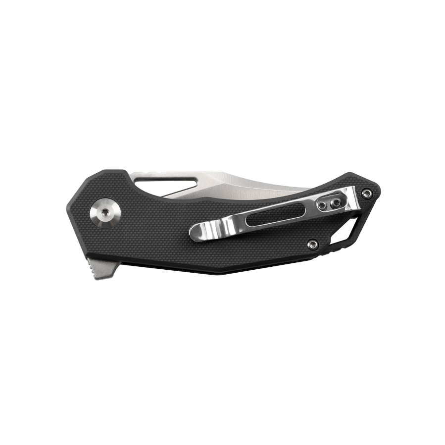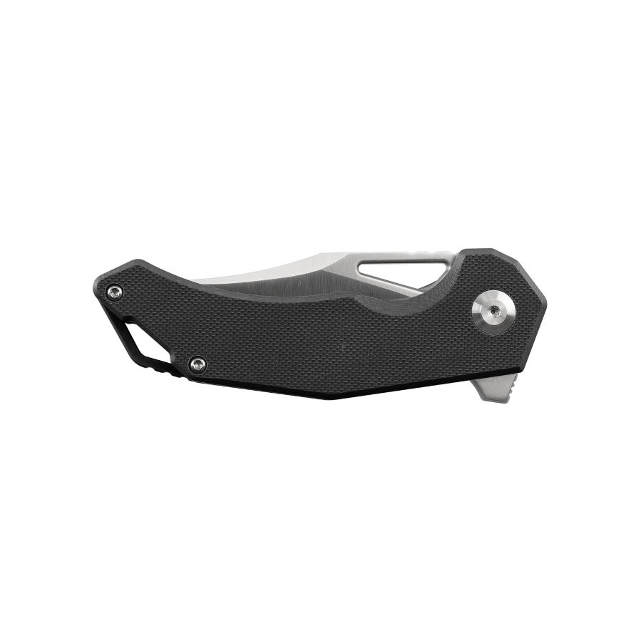 Клинок извлекается как с помощью незначительного отверстия под большой палец у основания, так и за счет флиппера с противоскользящими пропилами. Фиксируется лезвие за счет наличия стального замка типа Liner-Lock.