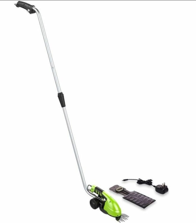 Ножницы-кусторез аккумуляторные GreenWorks 7,2 вольт. Устройство 2 в 1:· Ножницы садовые для стрижки травы и кромки газона;· Легкий ручной кусторез для ухода за кустарником.Применяется для финальной обработки газона или кустарника. Для этого в этом комплекте электро ножниц предусмотрено 2 вида ножей: для травы 8 см и кустарника 16 см. Для удобства стрижки газона предусмотрена специальная штанга-удлинитель с колесиками у основания. Смена оснастки не требует инструмента. Вес самого инструмента составляет всего 700 грамм (без штанги удлинителя) - это одно из самых легких и компактных устройств такого рода.Для комфортной работы рукоятка имеет прорезиненную поверхность. Количество резов в минуту производимое ножницами - 2400. Важным преимуществом модели является собственный встроенный литий-ионный аккумулятор с напряжением 7,2V и емкостью 2 А/ч. Время полной зарядки составляет 4,5 часа, а время автономной работы до 30 минут.