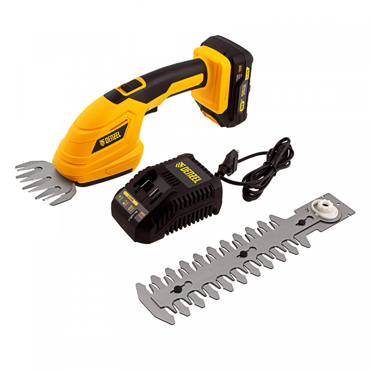 • Полный комплект поставки — аккумулятор и зарядное устройство прилагаются к ножницам-кусторезу.