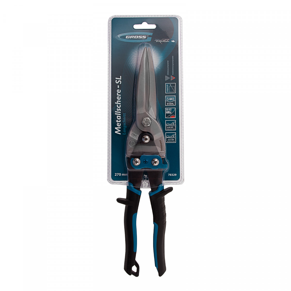 Ножницы по металлу Gross PIRANHA 78329 длиной 270 мм, из стали CrMo, с двухкомпонентными рукоятками, используются для прямого проходного реза плоских заготовок. Обеспечивают точный рез, справляются с холоднокатаной сталью толщиной до 0,94 мм и «нержавейкой» толщиной до 0,53 мм. Двойной рычажный механизм снижает нагрузку на руку мастера при резке твердых материалов. Ножницы предназначены для профессиональных слесарных работ, пригодятся также и в быту.