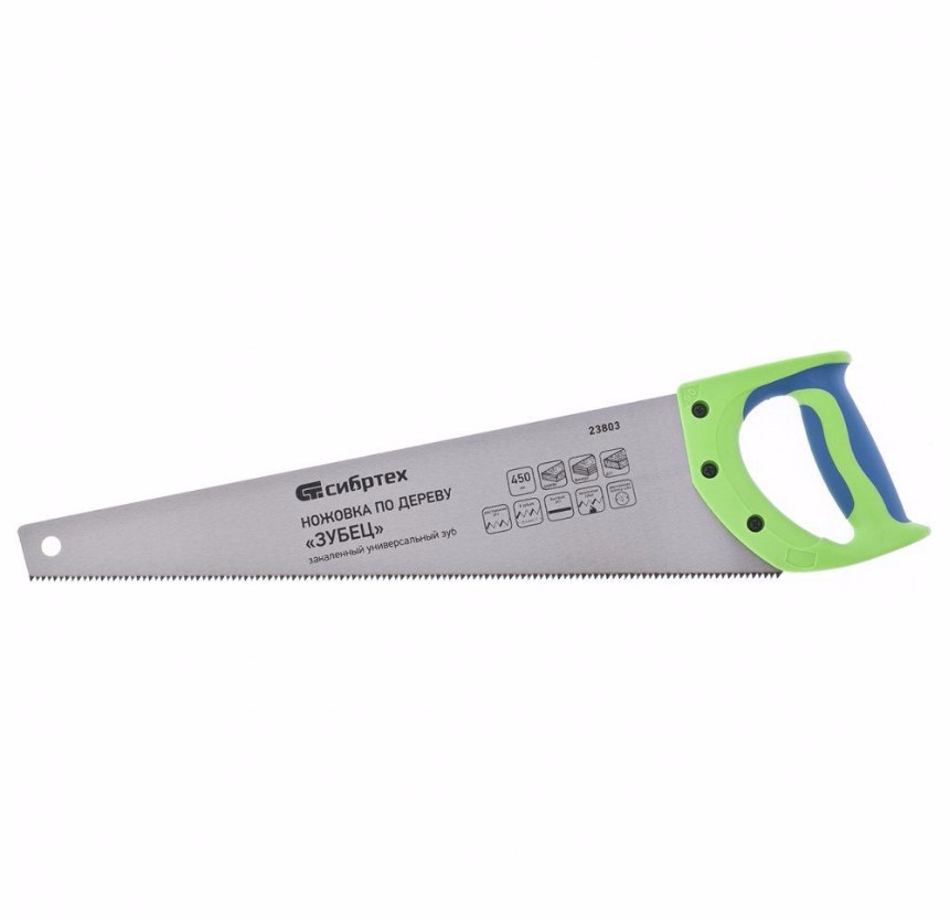 Ножовка по дереву 450 мм СИБРТЕХ Зубец 23803 - надежный ручной инструмент. Рабочая часть изготовлена из легированной стали, а зубья закалены, что обеспечивает продолжительный срок эксплуатации.