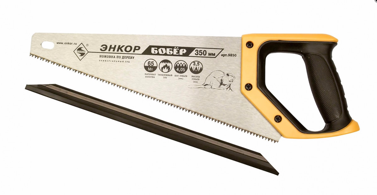 Ножовка с закаленным зубом Энкор Бобер 9850 предназначена для распила заготовок из древесины. Полотно выполнено из стали 65 Mn с заточенными под двумя углами зубьями. Пластиковая рукоятка частично обрезинена для надежного хвата и удобства при работе. Зубья высотой 3.5 мм разведены, что обеспечивает гладкость реза.