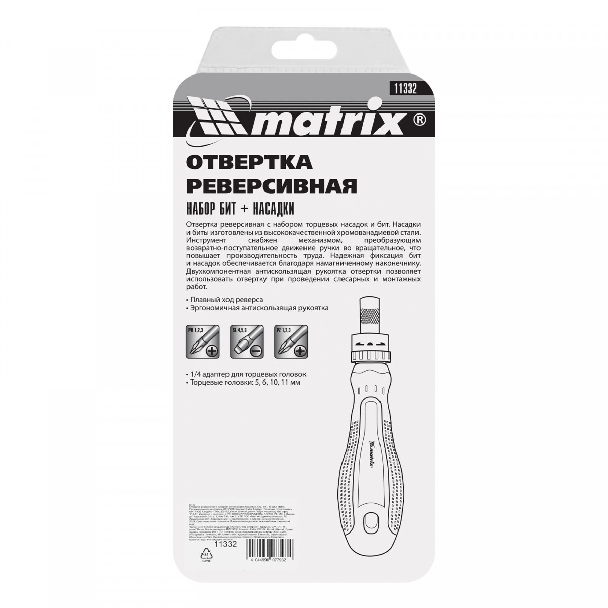Реверсивная отвертка Matrix 11332 с набором бит и торцевых насадок из стали CrV, с присоединительным размером 1/4", 16 шт. в упаковке, предназначена для работ с резьбовыми соединениями. Благодаря торцевым головкам с адаптером может использоваться в качестве накидного ключа. Храповой механизм облегчает вращение отвертки и увеличивает скорость работы. Направление вращения можно менять при помощи кольцевого переключателя. Отвертка пригодится при сборке и установке мебели, ремонте бытовой техники, будет полезна дома, на даче или в гараже.