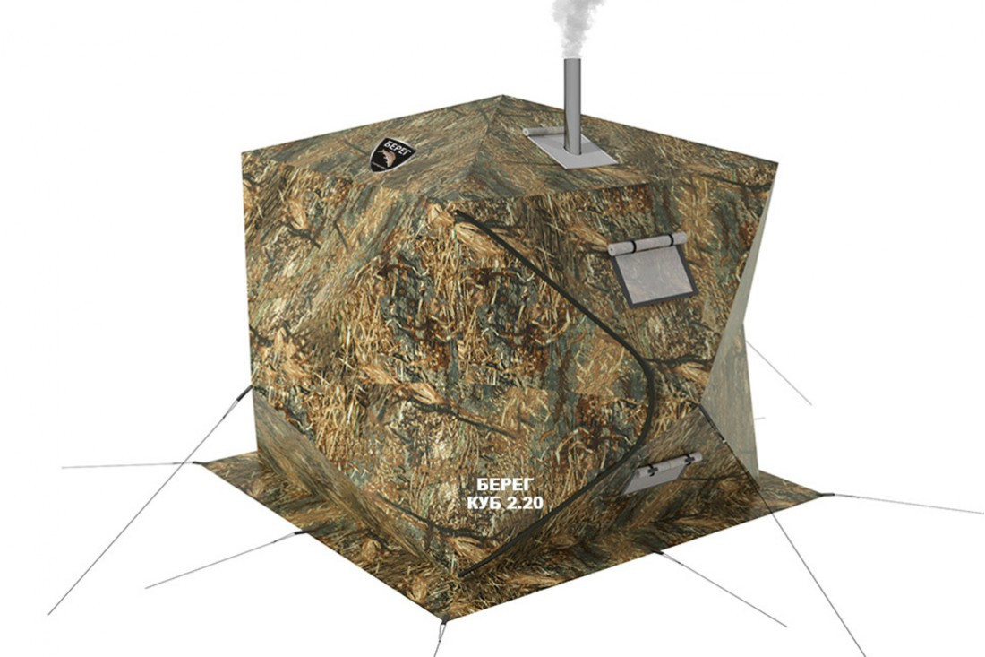 Берег Куб 2.20 – зимняя универсальная палатка для рыбалки, охоты и организации походной бани. Палатка Куб 2.20 оснащена надежным алюминиевым каркасом и плотным внешним тентом из влагоотталкивающего материала. Комплектация палатки включает в себя 2 входа, 2 окна, 2 кармана с отсеками для личных вещей, разделку дымохода 90 мм.