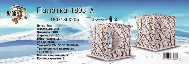 Тип: Палатка-куб Количество мест (чел) 2 Цвет: Зимний лес Материал: NYLON 300D THERMAL Утеплитель: Холлофайбер Длина: 180 см Ширина: 180 см Высота: 205 см Кол-во окон: 2 + 2 прозрачных слайдера на окна + 1 переходник под печь Размер окон: 30 х 30 см Кол-во технических карманов: 2 Кол-во люверсов: 12 Ввертыши: 4 штуки (металл, пластик). Транспортный размер, см :17х17х130 Вес: 12 кг. Сумка-чехол: есть