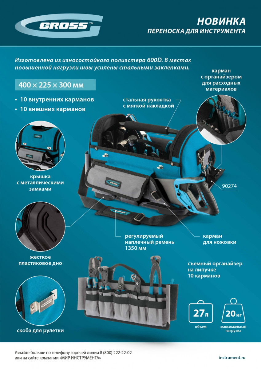 • Дополнительные возможности — в переноске предусмотрен отдельный карман для ножовки, а также зацеп для рулетки.