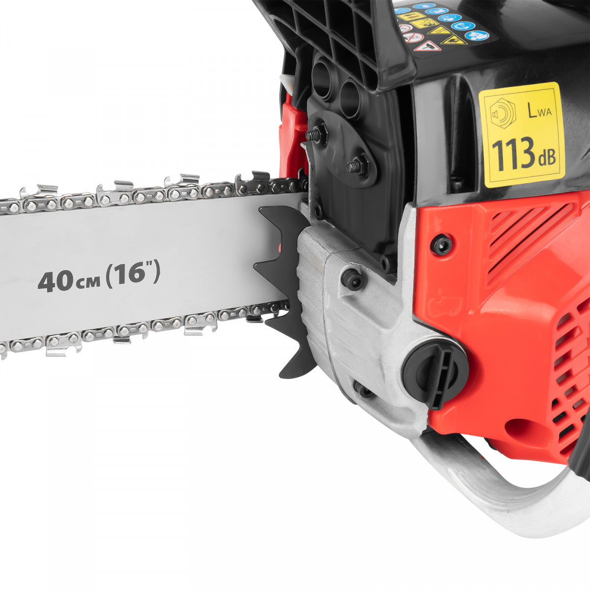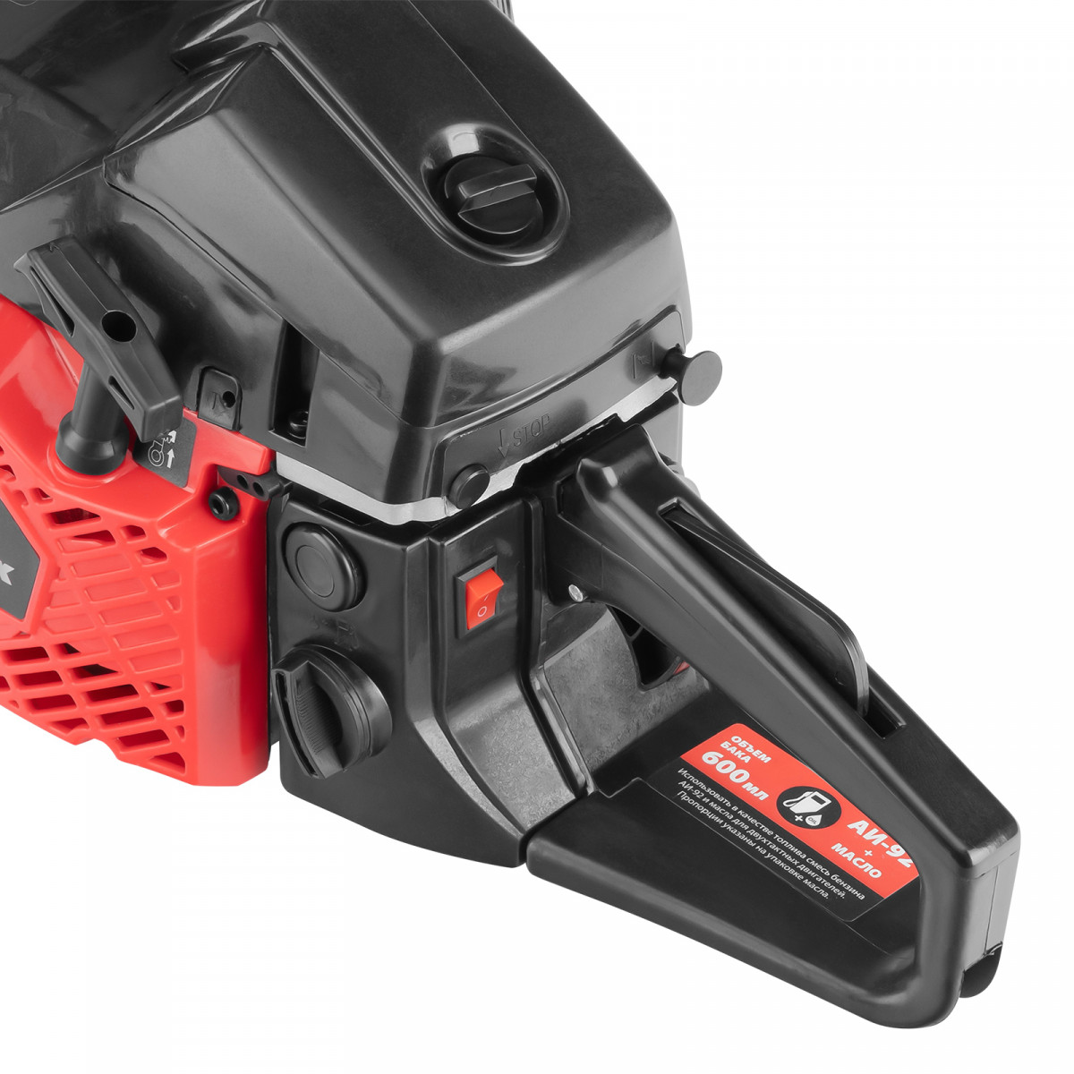 • Безопасная эксплуатация — функция блокировки газа предотвращает случайный запуск, тормоз цепи снижает риск травмирования при отскоке пилы.