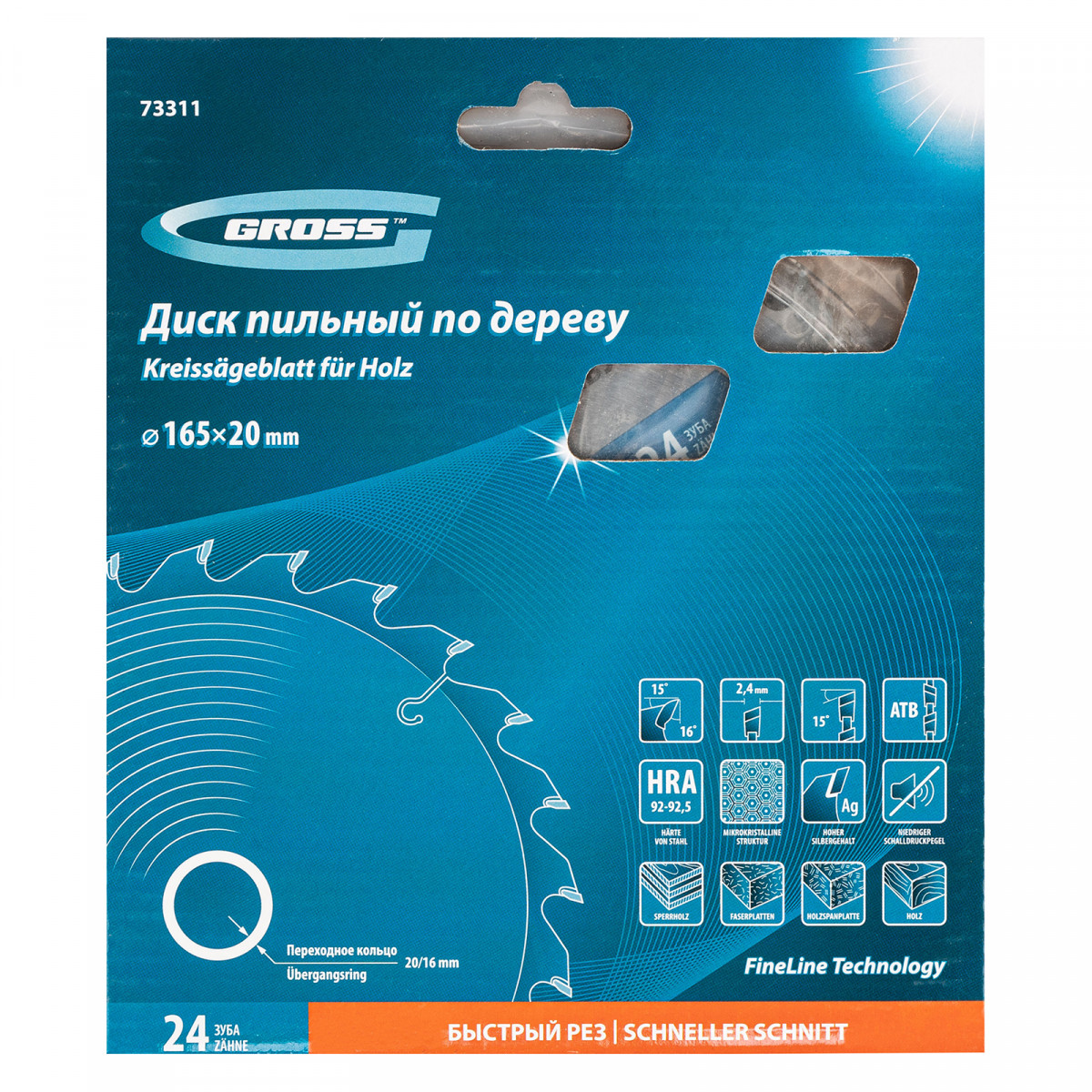 Пильный диск Gross 73311, ф165 х 20 мм, с 24 зубьями и переходным кольцом 20/16 мм, предназначен для распила древесины мягких и твердых пород, ДСП, МДФ и фанеры. Является оснасткой для циркулярных и торцовочных пил с посадочным диаметром 20 мм, благодаря универсальному типу зубьев АТВ подходит как для продольного, так и для поперечного реза материалов. Диск изготовлен на высококачественном оборудовании, специально рассчитан на профессиональное применение и выполнение большого объема работ.