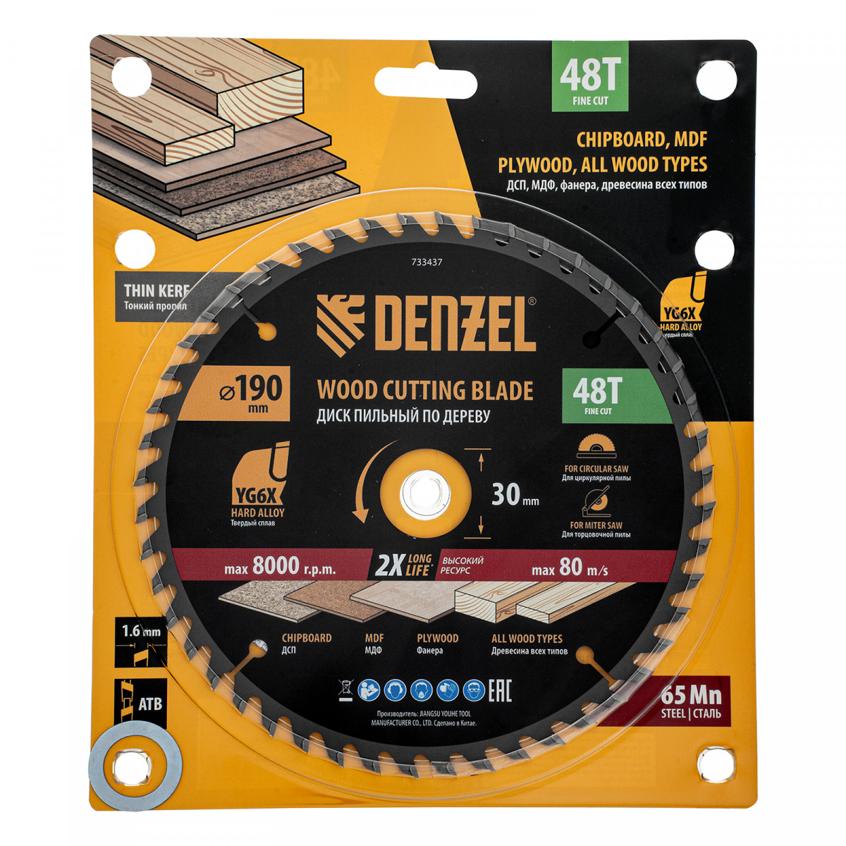 Пильный диск по дереву ф190 х 30 мм, 48 зубьев, тонкий Denzel