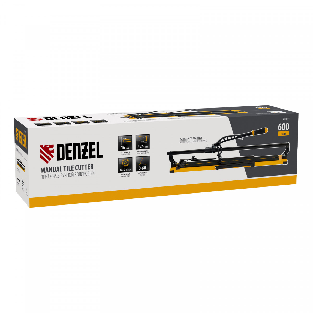 Ручной плиткорез Denzel 877014 с рельсовой направляющей и стальной станиной, с кареткой на подшипниках и усиленной рукояткой-пеналом, предназначен для прямой и диагональной резки керамической плитки и керамогранита длиной до 600 мм и толщиной до 16 мм. Раздвижные упоры упрощают работу с плиткой большого размера. Инструмент используется для проведения отделочных работ.