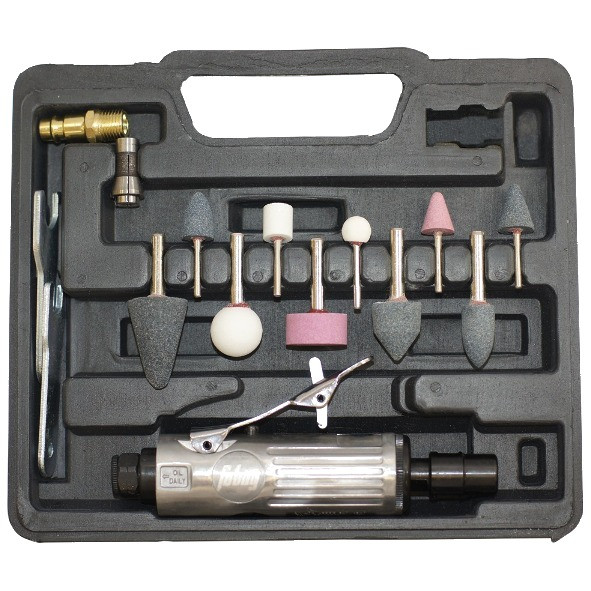 Прямая пневмошлифмашина предназначена для мелких шлифовальных работ. Инструмент работает на сжатом воздухе, что предусматривает возможность более длительной работы без перерыва, чем электроинструмент, а также малый вес за счет отсутствия двигателя. Данная модель поставляется в кейсе с оснасткой. В комплект набора входит: пневмошлифмашина, 2 ключа, 5 камней 3 мм, 5 камней 6 мм, 1 цанга 3 мм, 1 штуцер 1/4", 1 цанга 6 мм, кейс.