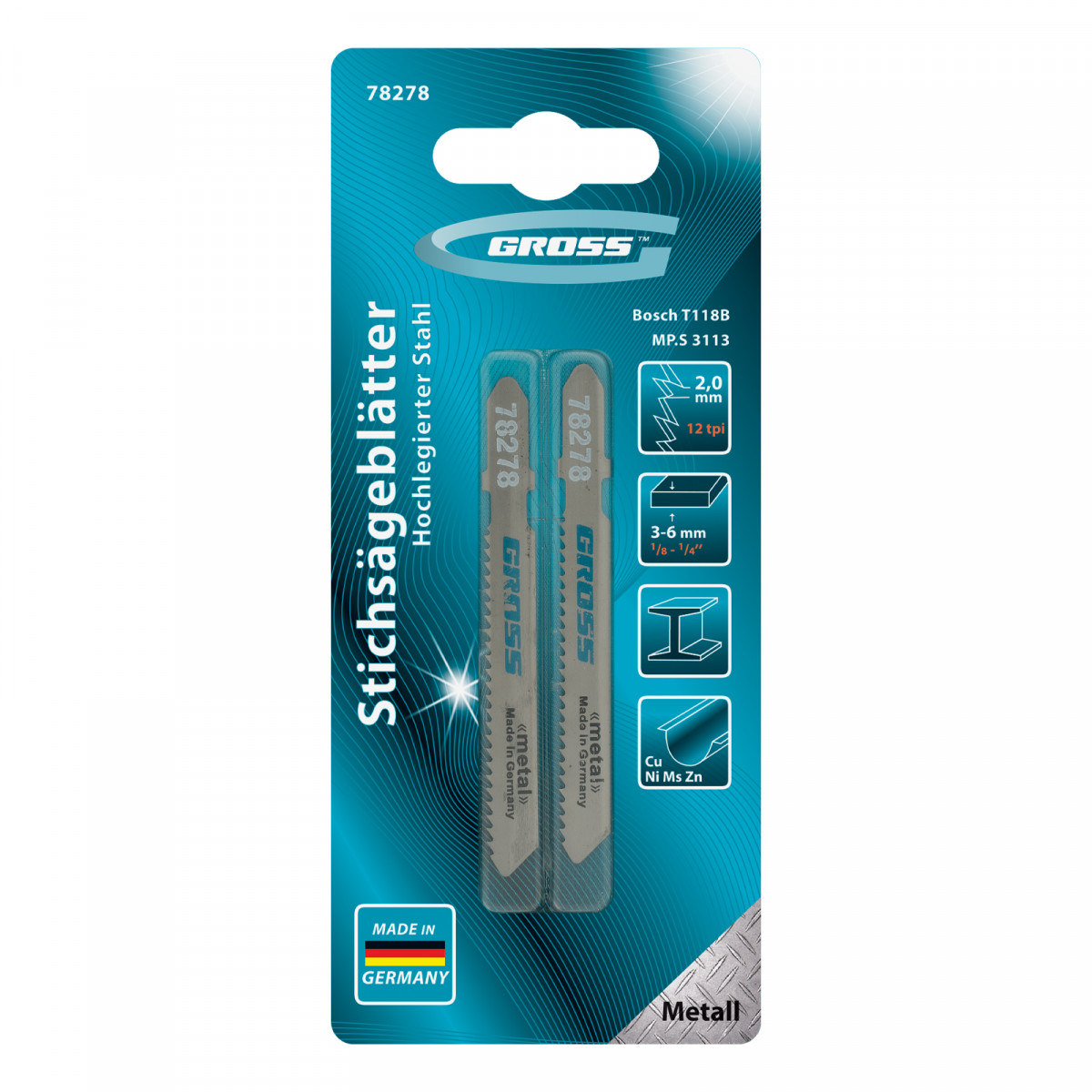Полотна по металлу 3113-T118B Gross 78278, 2 шт. в упаковке, — сменные режущие элементы, подходящие для большинства современных электролобзиков. Производят прямой рез металлических, стальных заготовок, листового железа, изделий из стеклопластика, текстолита и прочих композитных материалов толщиной 3-6 мм. Предназначены для профессионального применения во время ремонтных и строительных работ.