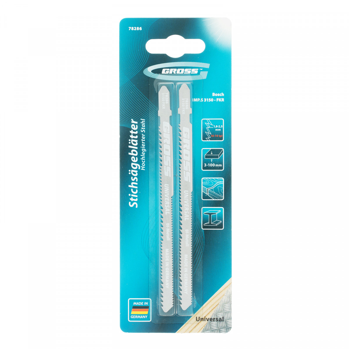 Универсальные двусторонние полотна Gross 78286, 2 шт. (3150 - FKR), предназначены для фигурного и чистого прямого реза под свободным углом. Позволяют работать практически с любым типом материалов: черным и цветным металлом, алюминиевым профилем и трубами толщиной 3-10 мм, оргстекла и пластмассы 3-100 мм, ламината, ДСП, древесины 5-100 мм, в том числе клееной. Полотна изготовлены из качественных материалов на высокотехнологичном производстве в Германии, поэтому рассчитаны на профессиональное использование.
