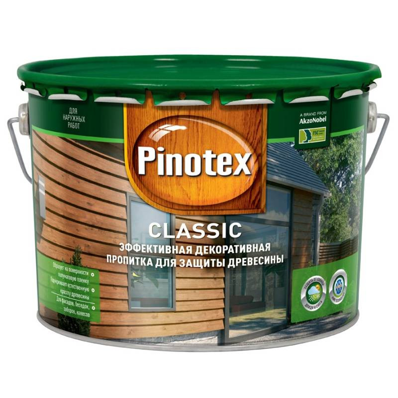 Эффективная декоративно-защитная пропитка для древесины. Пропитка Pinotex Classic разработана с применением AWB- технологии и глубоко проникает в структуру древесины, препятствует грибковым заражениям, проявлению гнили древесины и плесени. Окрашенная поверхность устойчива к воздействию солнца, дождя, снега, мороза. Пропитка легко наносится и быстро впитывается в поверхность древесины. Область применения: для наружных работ. Возможно использование внутри помещения с обязательным покрытием поверхностным слоем лака, предназначенного для интерьеров. Рекомендуется для фасадов деревянных домов, беседок, заборов, навесов, садовой мебели и иных наружных деревянных поверхностей из пиленой и строганой древесины. Идеально подходит для бревенчатых строений и полукруглых облицовочных профилей. Расход: пиленая древесина - до 9 м2/л (130 г/м2.), строганная древесина – до 16 м2/л (70 г/м2.). Время высыхания при 23С 50% RH: до нанесения следующего слоя - 6-8 часов. Полное высыхание - 24 часа.
