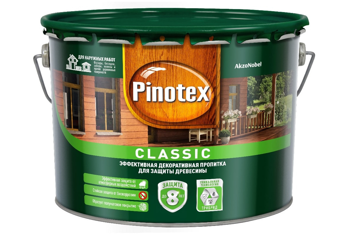 Эффективная декоративная пропитка для защиты древесины. Пропитка cодержит активные добавки против плесени и синевы. Окрашенная поверхность устойчива к воздействию солнца, дождя, снега и мороза. Pinotex Classic легко наносится и быстро впитывается в поверхность древесины, образуя полуматовое покрытие. Подчеркивает естественную текстуру древесины. Для усиленной защиты глубоких слоев древесины от биокоррозии рекомендуется применять пропитку в системе с грунтовкой Pinotex Base.