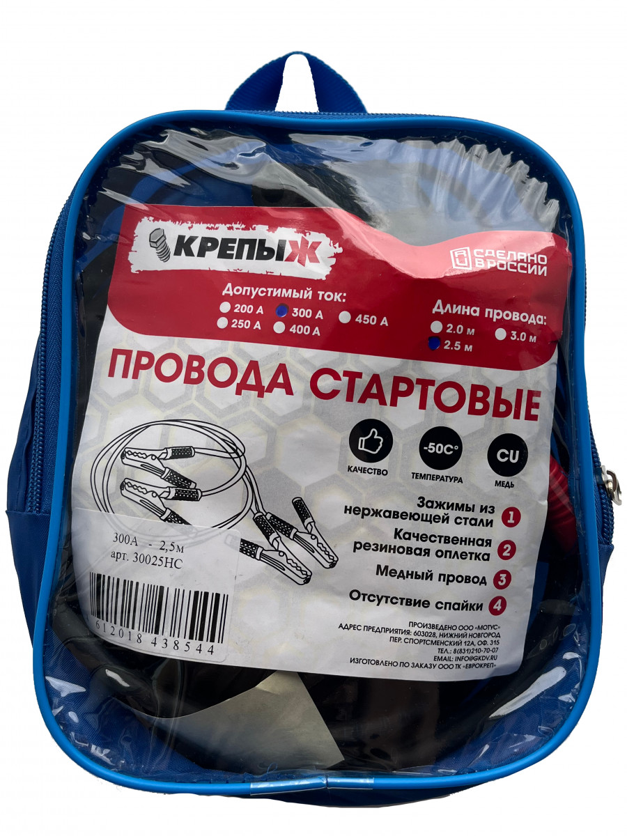 Провода стартовые КРЕПЫЖ нержавейка 300 Ампер длина 2,5 метра в сумке
