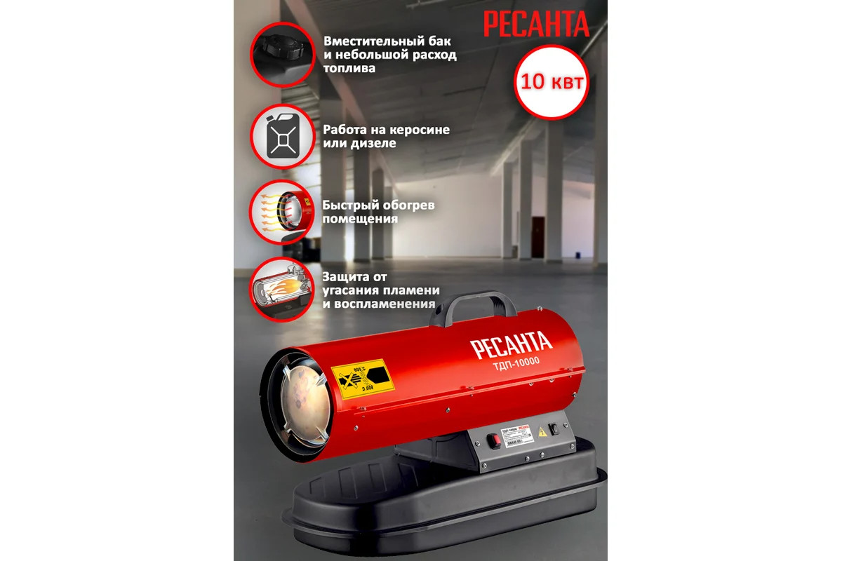 Ресанта ТДП-10000 относится к приборам с прямым типом нагрева. Промышленный вентилятор с производительностью 320 м³/час прогоняет воздух сквозь пламя горелки. Температура выходящего воздуха достигает 800 градусов. Продукты горения отводятся вместе с воздухом. Поэтому дизельные тепловые пушки рекомендовано использовать в нежилых помещениях с качественной вентиляцией.