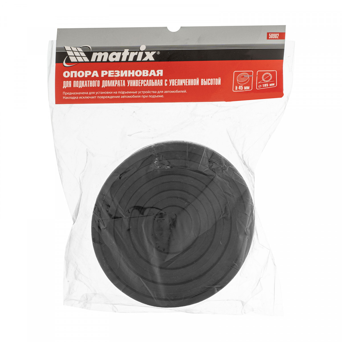 Универсальная резиновая опора Matrix 50902 с увеличенной высотой предназначена для использования совместно с подкатными домкратами. Благодаря ей днище и кузов авто, а также верхняя часть домкрата надежно защищены от механических повреждений. Опору можно использовать с домкратами 510105, 51035, 51045.