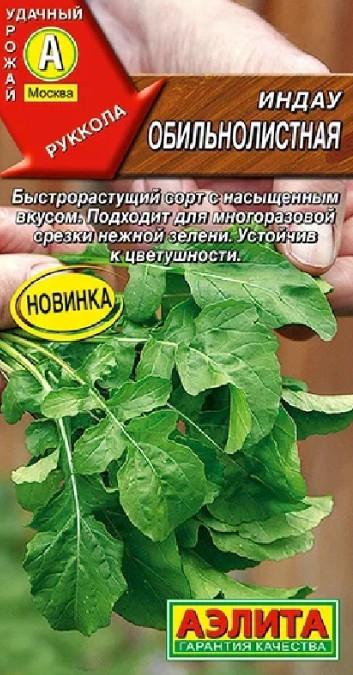 Быстрорастущая зеленная культура с насыщенным острым вкусом. Отличительной особенностью сорта является повышенная устойчивость к ранней цветушности и возможность многоразовой выборочной срезки. Это сокращает до минимума необходимость изнурительных повторных посевов индау (рукколы) для получения нежной зелени в течение лета. Через 3-4 недели от всходов растение образует пышную розетку крупных сочных листьев, которые нужно срывать регулярно. Сорт великолепен в овощных и теплых мясных (рыбных) салатах, придает им неповторимую нотку свежести и пикантности.