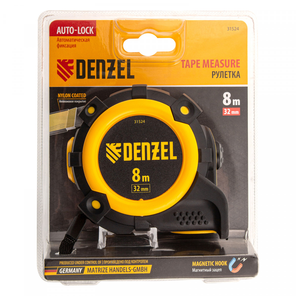 Рулетка 8м х 32мм, автоматич. фиксац., нейлон. покрытие, магнит. зацеп, двухстор. разметка Denzel