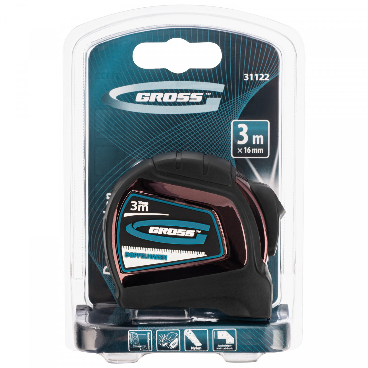 Рулетка "Doppelhaken",3 м x 16 мм,односторонний зацеп,Нейлон,двусторонняя шкала,автоматическая фиксация Gross